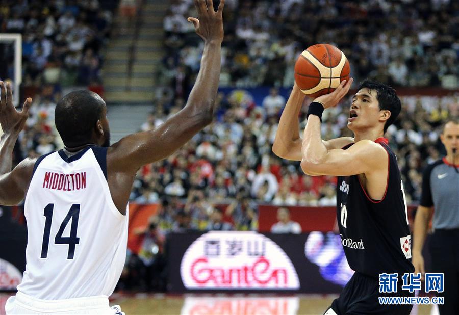 9月5日,日本队球员渡边雄太(右)在比赛中投篮。 当日,在上海举行的2019年国际篮联篮球世界杯小组赛E组比赛中,美国队以98比45战胜日本队。 新华社记者陈飞摄