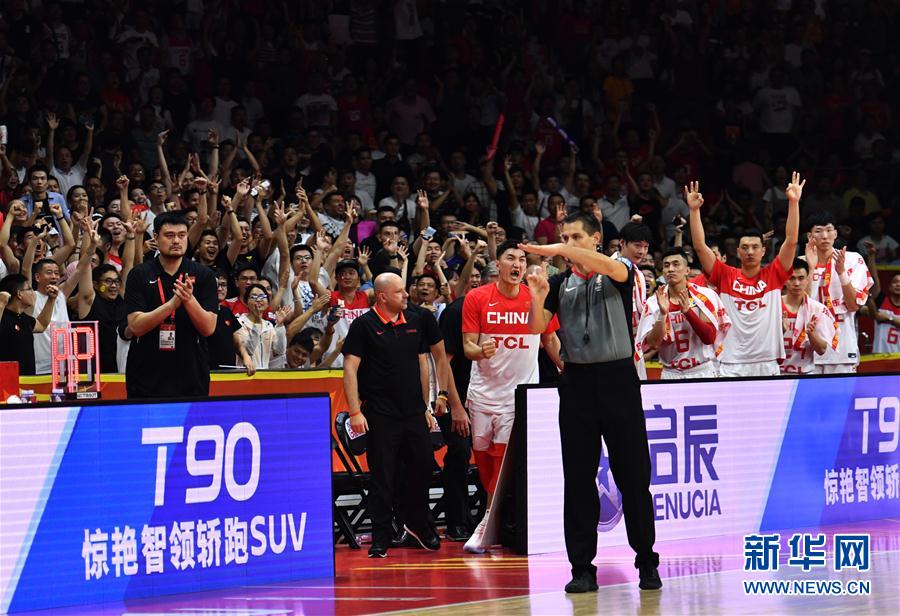 9月8日,中国队球员和球迷在比赛中庆祝进球。 当日,在广州举行的2019年国际篮联篮球世界杯小组赛第二阶段比赛中,中国队以73比86负于尼日利亚队。 新华社记者贺长山摄