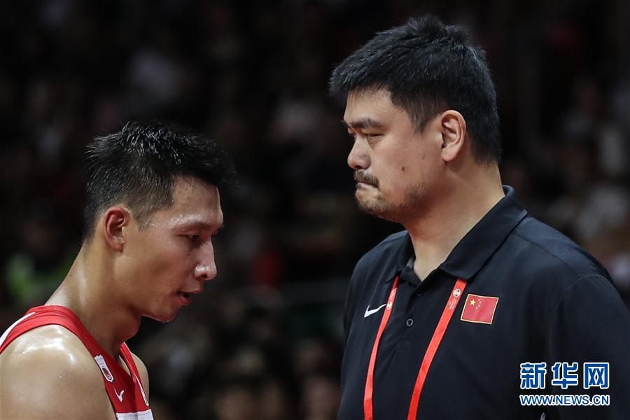 9月8日,中国队球员易建联(左)与中国篮球协会主席姚明在比赛中。 当日,在广州举行的2019年国际篮联篮球世界杯小组赛第二阶段比赛中,中国队以73比86负于尼日利亚队。 新华社记者潘昱龙摄