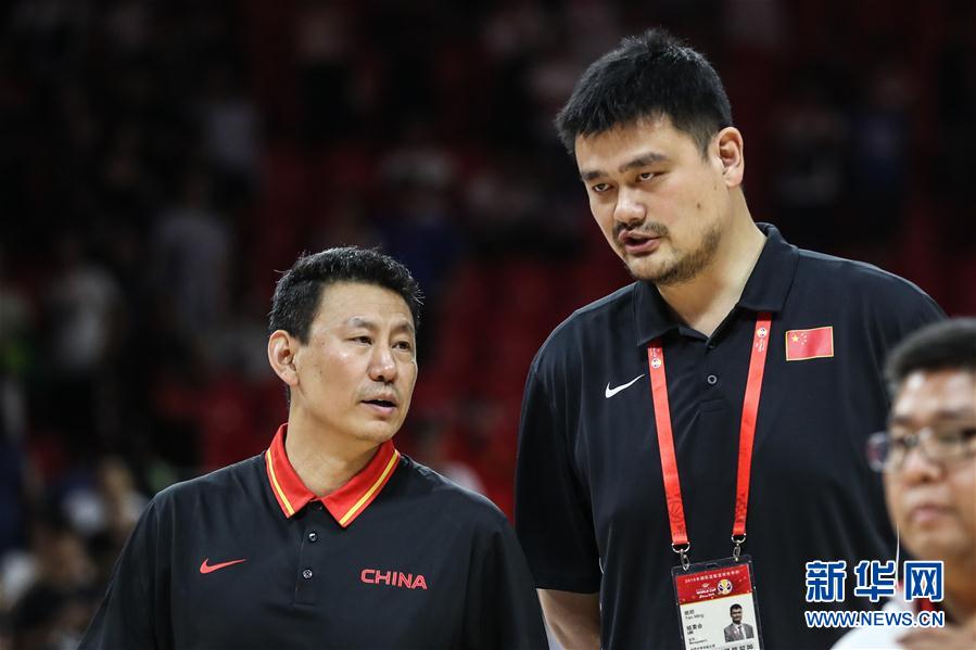 9月8日,中国篮球协会主席姚明(右)在比赛后与中国队主教练李楠交流。 当日,在广州举行的2019年国际篮联篮球世界杯小组赛第二阶段比赛中,中国队以73比86负于尼日利亚队。 新华社记者潘昱龙摄