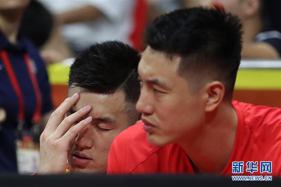 9月8日,中国队球员郭艾伦(左)在替补席上休息。 当日,在广州举行的2019年国际篮联篮球世界杯小组赛第二阶段比赛中,中国队以73比86负于尼日利亚队。 新华社记者潘昱龙摄