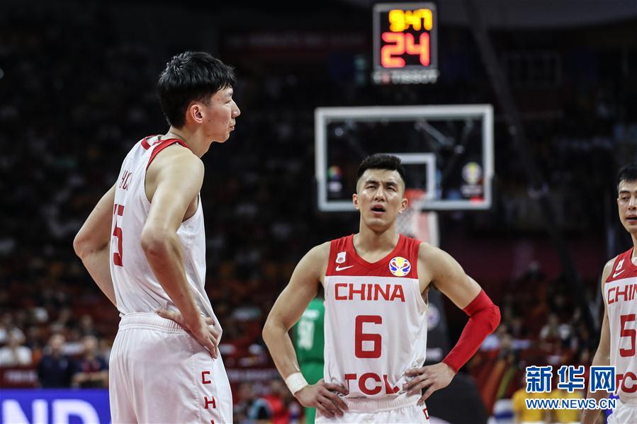 9月8日,中国队球员周琦(左)五次犯规后离场。 当日,在广州举行的2019年国际篮联篮球世界杯小组赛第二阶段比赛中,中国队以73比86负于尼日利亚队。 新华社记者潘昱龙摄