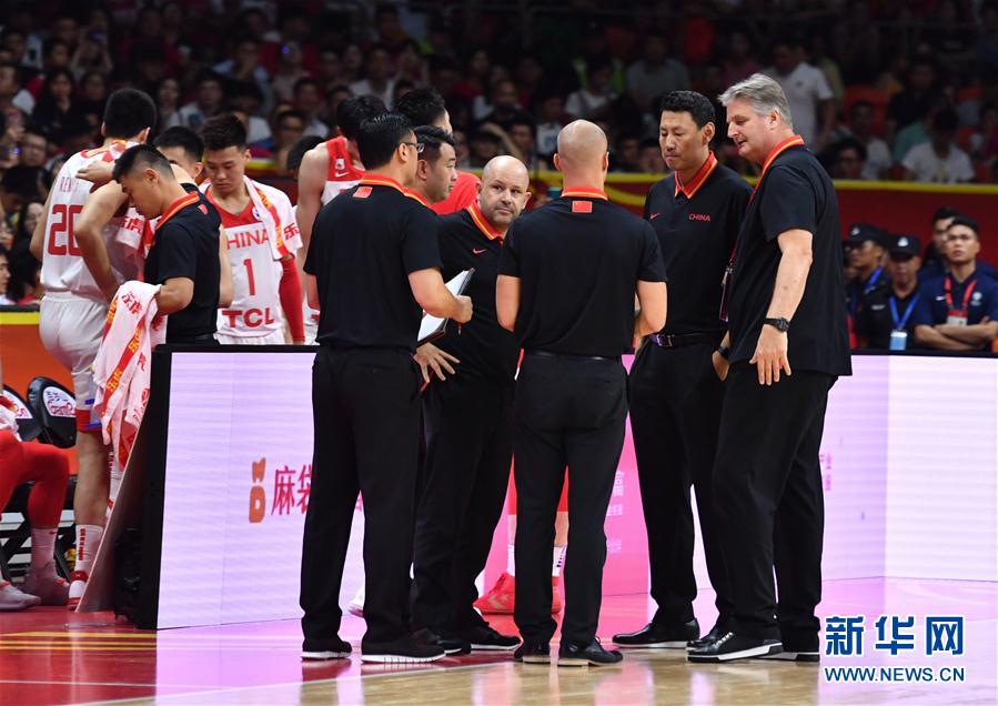 9月8日,中国队教练组在比赛间隙商讨战术。 当日,在广州举行的2019年国际篮联篮球世界杯小组赛第二阶段比赛中,中国队以73比86负于尼日利亚队。 新华社记者贺长山摄