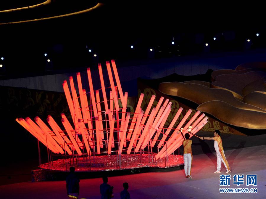9月8日,火炬手贾占波(右)、孙甜甜点亮56枝花瓣组成的“同心花蕊”。 当日,第十一届全国少数民族传统体育运动会开幕式在河南省郑州市举行。 新华社记者冯大鹏摄