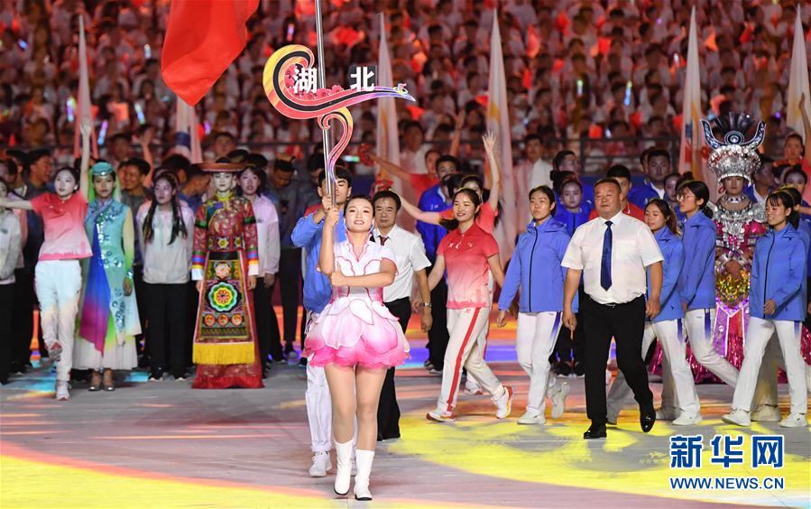 9月8日,湖北代表团步入会场。 当日,第十一届全国少数民族传统体育运动会开幕式在河南省郑州市举行。 新华社记者朱祥摄