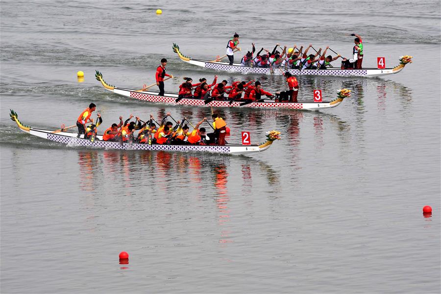 9月9日,河南队、广东队和湖南队(由上至下)在混合组小龙舟200米直道竞速轮次赛中。 当日,第十一届全国少数民族传统体育运动会龙舟比赛在河南省郑州市龙湖水上基地开赛。 新华社记者李安摄