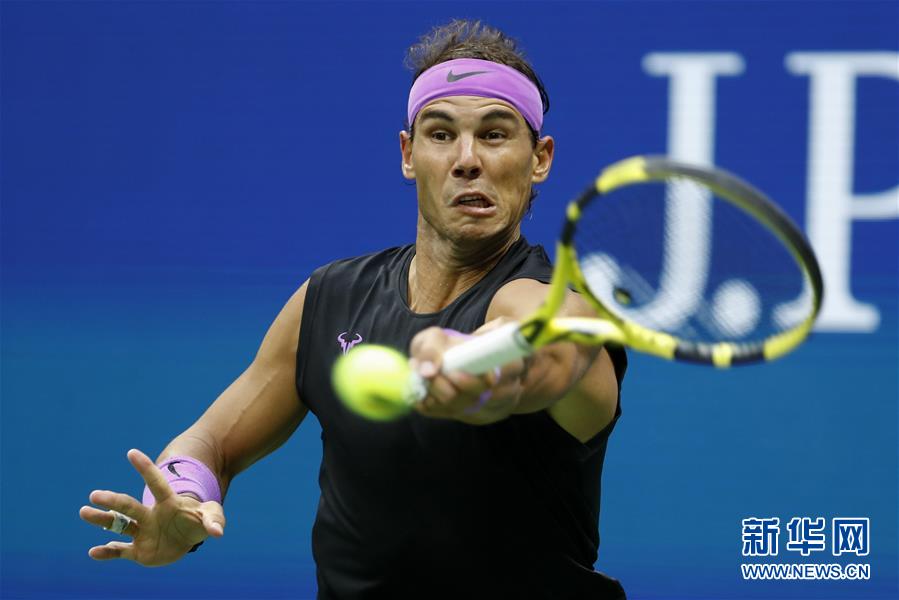 9月8日,纳达尔在比赛中回球。 当日,在2019美国网球公开赛男单决赛中,西班牙选手纳达尔以3比2战胜俄罗斯选手梅德韦杰夫,夺得冠军。 新华社记者李木子摄