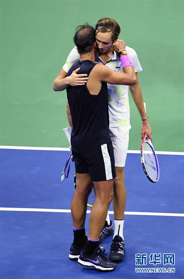 9月8日,纳达尔(左)与梅德韦杰夫在比赛后拥抱。 当日,在2019美国网球公开赛男单决赛中,西班牙选手纳达尔以3比2战胜俄罗斯选手梅德韦杰夫,夺得冠军。 新华社记者刘杰摄