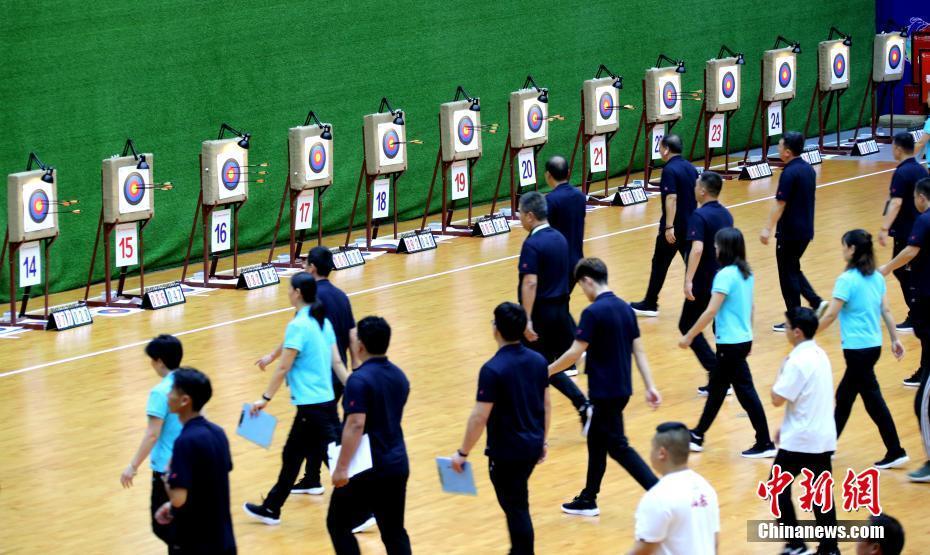 9月9日,第十一届全国少数民族传统体育运动会射弩比赛在河南省郑州市第十一中学举行。图为工作人员前往查看靶环。中新社记者 王中举 摄