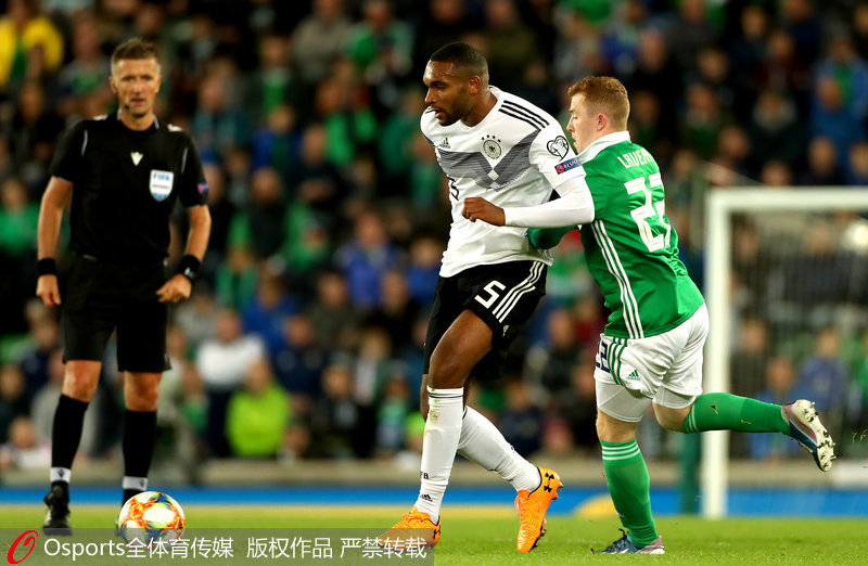 人民网北京9月10日电(杨磊) 北京时间9月10日凌晨,欧洲杯预选赛C组比赛继续进行,德国客场2比0击败北爱尔兰,积分追平对方并登上榜首。哈尔斯滕贝格打进国家队处子球,格纳布里终场前破门。