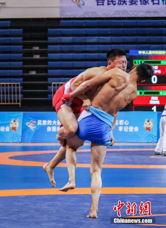 9月10日,选手在比赛中。当日,第十一届全国少数民族传统体育运动会民族式摔跤项目比赛在河南省郑州市举行。 中新社记者 王中举 摄