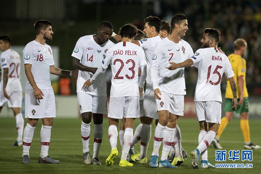 9月10日,葡萄牙队球员在比赛中庆祝进球。 当日,在2020年欧洲足球锦标赛预选赛B组比赛中,葡萄牙队客场以5比1战胜立陶宛队。 新华社发(阿尔弗雷达斯·普里亚迪斯摄)