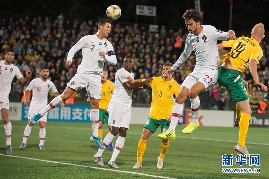 9月10日,葡萄牙队球员克里斯蒂亚诺·罗纳尔多(上左)在比赛中争顶。 当日,在2020年欧洲足球锦标赛预选赛B组比赛中,葡萄牙队客场以5比1战胜立陶宛队。 新华社发(阿尔弗雷达斯·普里亚迪斯摄)