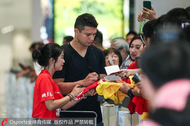 人民网北京9月12日电 世预赛40强赛中国男足首战告捷后,队员已返回国内。首秀归来的艾克森心情大好,双手点赞为球迷签名。
