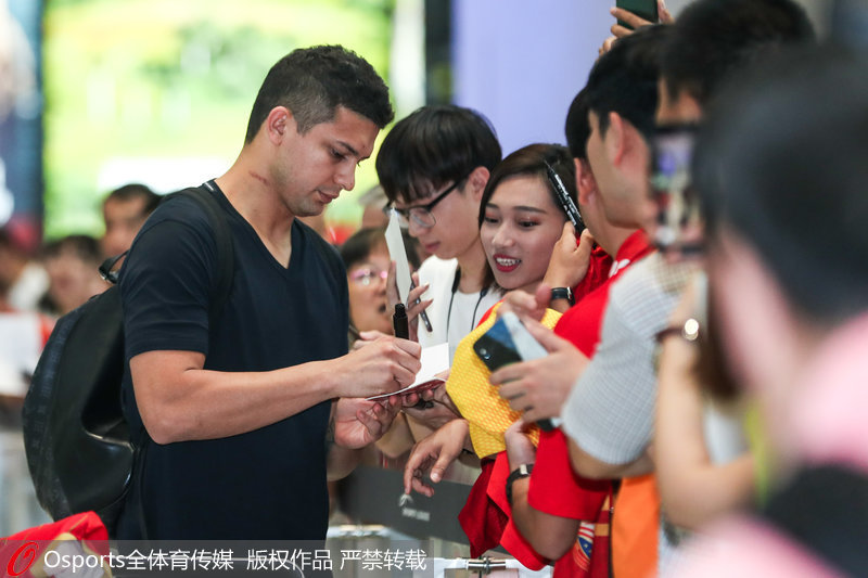 人民网北京9月12日电 世预赛40强赛中国男足首战告捷后,队员已返回国内。首秀归来的艾克森心情大好,双手点赞为球迷签名。