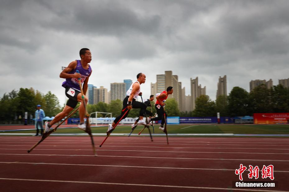 9月11日,第十一届全国少数民族传统体育运动会高脚竞速项目在河南郑州开赛。高脚竞速运动是由运动员双手各持一杆,同时脚踩杆上的踏镫,在田径场上进行的比赛,以在同等的距离内所用的时间多少决定名次。 中新社记者 王中举 摄