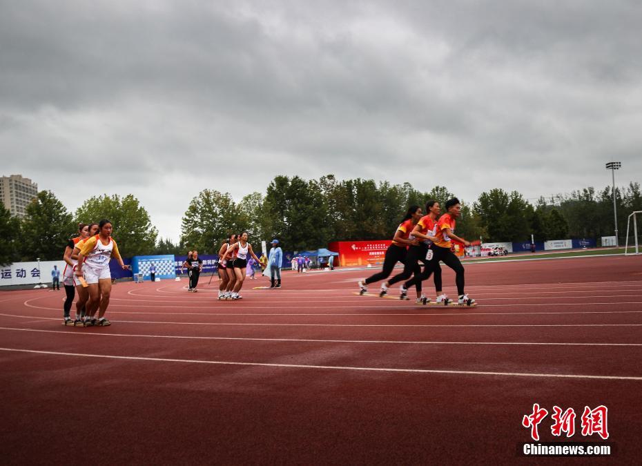 9月11日,第十一届全国少数民族传统体育运动会板鞋竞速项目在河南郑州开赛,选手步调一致风驰电掣。板鞋竞速是由多名运动员一起将足套在同一双板鞋上,在田径场上进行的比赛,以在同等的距离内所用的时间多少决定名次。 中新社记者 王中举 摄