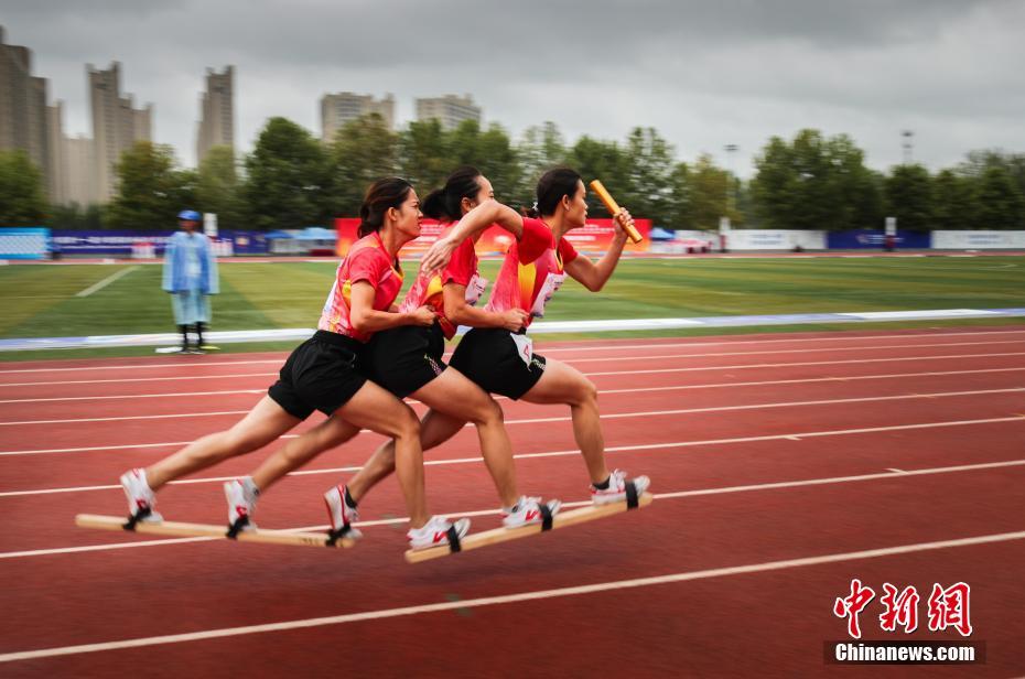 全国少数民族传统体育运动会:选手步调一致角逐板鞋竞速