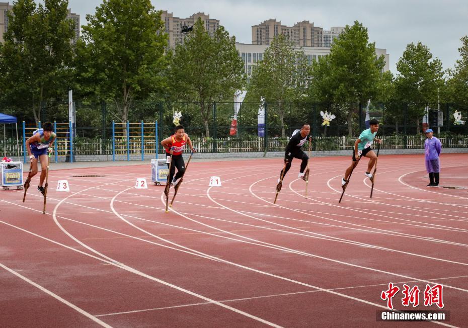 9月11日,第十一届全国少数民族传统体育运动会高脚竞速项目在河南郑州开赛。高脚竞速运动是由运动员双手各持一杆,同时脚踩杆上的踏镫,在田径场上进行的比赛,以在同等的距离内所用的时间多少决定名次。 中新社记者 王中举 摄