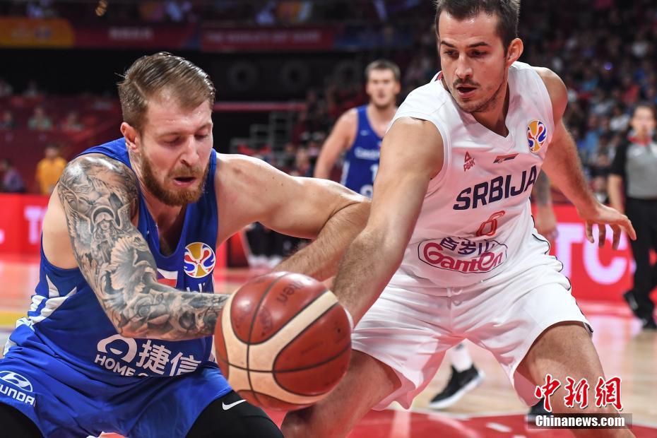 9月14日,2019男篮世界杯排位赛在北京进行。塞尔维亚队以90比81胜捷克队,最终获本届男篮世界杯第5名,捷克队名列第6。图为捷克球员奥达(左)与塞尔维亚球员别利察(右)在比赛中。中新社记者 崔楠 摄