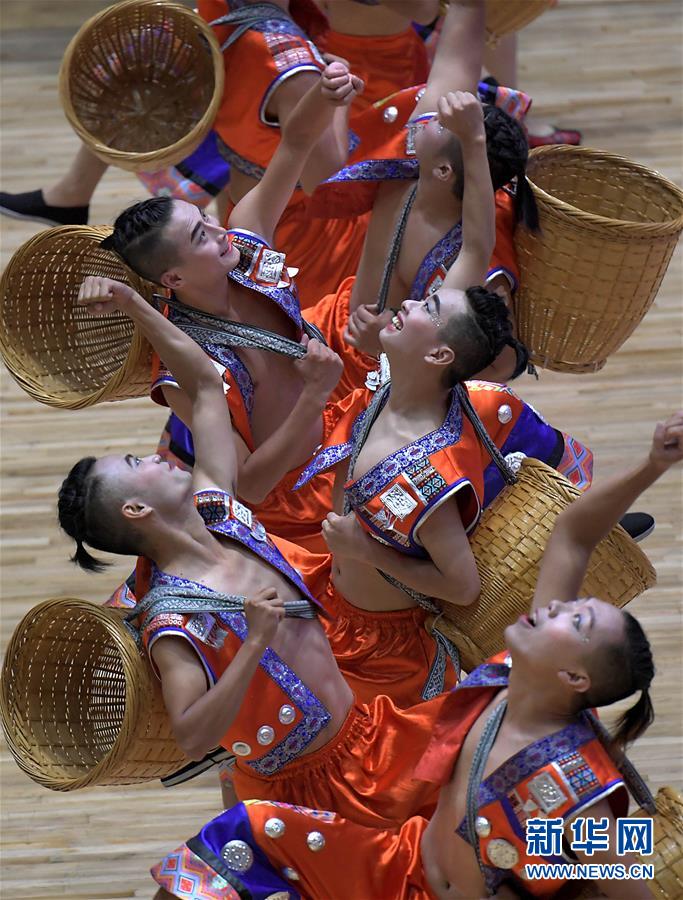 新华社照片,郑州,2019年9月14日 (民族运动会)(1)表演项目——民族体育“玩”出花样来 9月14日,湖南代表队选手在表演节目《掷幸福球》。 当日,第十一届全国少数民族传统体育运动会表演项目在河南郑州继续进行。 新华社记者李安摄