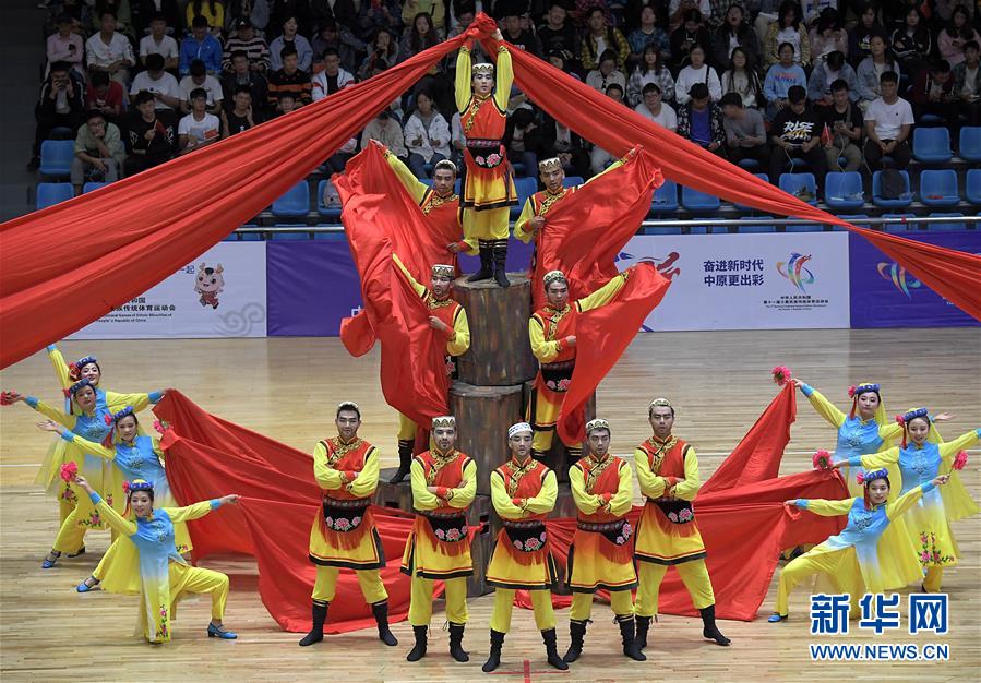 9月14日,甘肃代表队选手在表演《鼓舞风雷》。 当日,第十一届全国少数民族传统体育运动会表演项目在河南郑州继续进行。 新华社记者李安摄