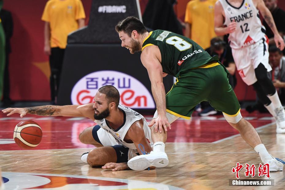 9月15日,2019男篮世界杯季军争夺战在北京进行。最终法国队以67比59战胜澳大利亚队,夺得本届男篮世界杯季军。图为双方球员争抢地板球。中新社记者 崔楠 摄