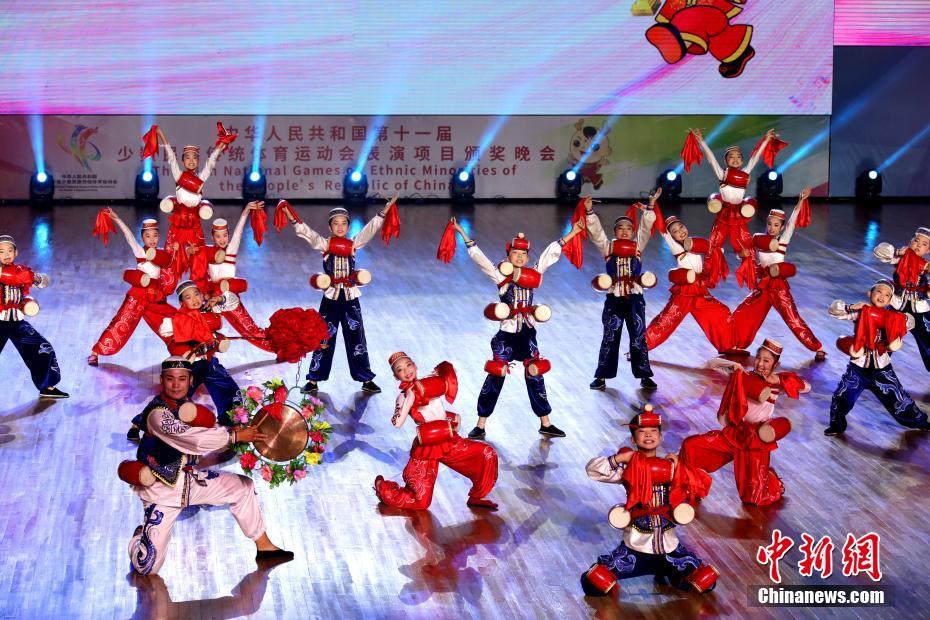 9月15日晚,第十一届全国少数民族传统体育运动会表演项目颁奖晚会在郑州工程技术学院体育馆举行,先后有27个优秀节目进行展演。图为优秀节目展演。中新社记者 王中举 摄