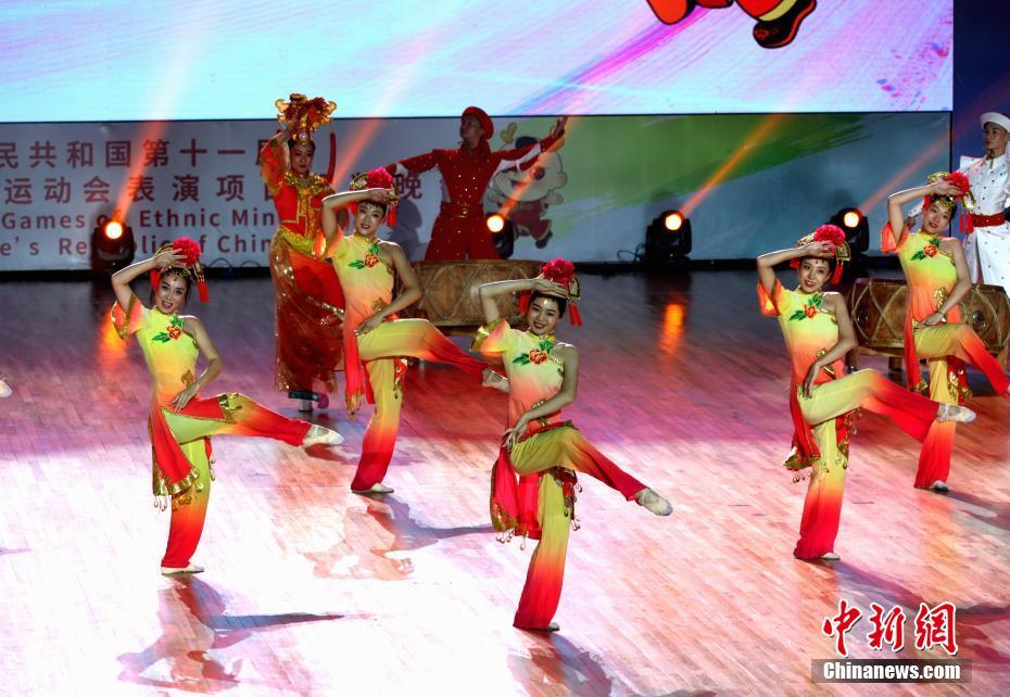 9月15日晚,第十一届全国少数民族传统体育运动会表演项目颁奖晚会在郑州工程技术学院体育馆举行,先后有27个优秀节目进行展演。图为优秀节目展演。中新社记者 王中举 摄