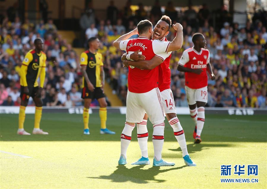 9月15日,阿森纳队球员奥巴梅扬(前右)在进球后与队友科拉希纳茨庆祝。 当日,在2019-2020赛季英格兰足球超级联赛第五轮比赛中,阿森纳队客场以2比2战平沃特福德队。 新华社/路透