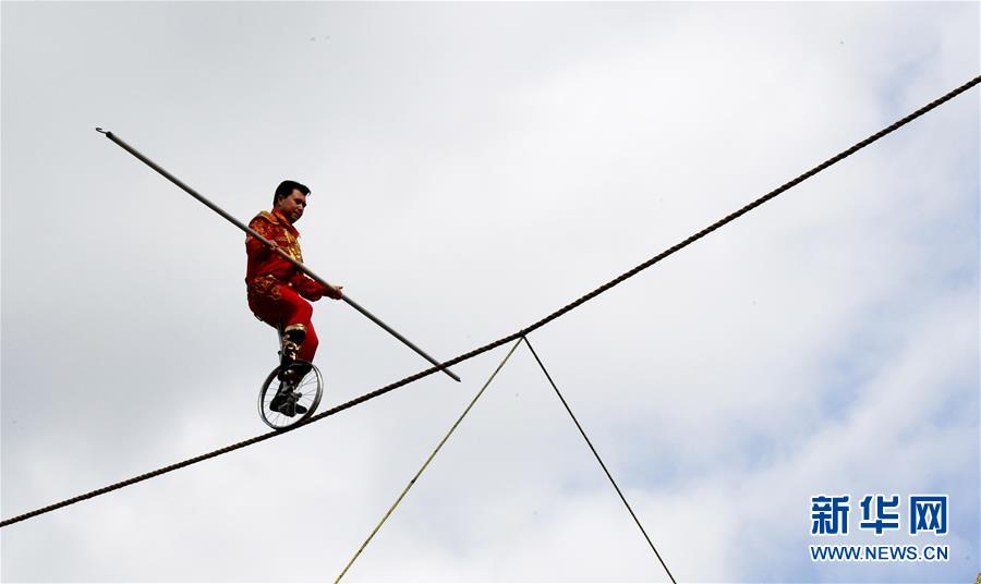 新疆代表队选手阿迪力在第十一届全国少数民族传统体育运动会上表演达瓦孜(2019年9月13日摄)。 (配本社同题文字稿) 新华社记者朱祥摄