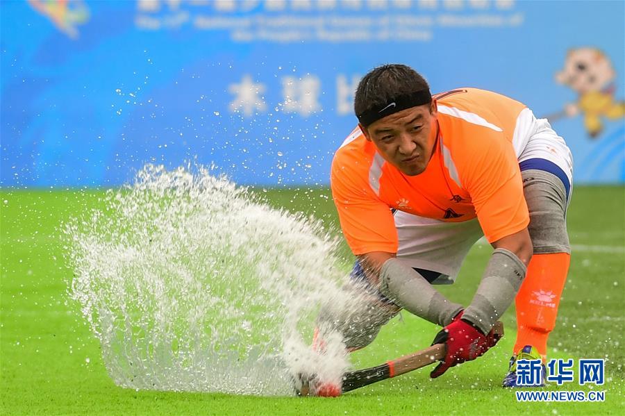 宁夏队球员马玉河在第十一届全国少数民族传统体育运动会木球半决赛中击球(2019年9月15日摄)。 (配本社同题文字稿) 新华社记者胡超摄