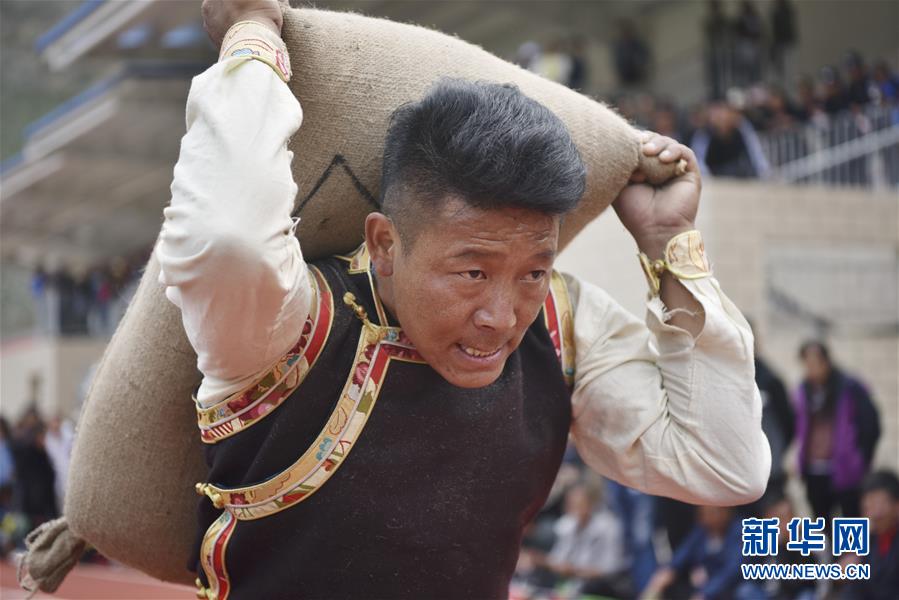 9月18日,选手在抱沙袋比赛中。参赛选手需要扛着重量超过100千克的沙袋绕场行走,行走距离最远者获胜。 近日,一场藏族传统体育运动会在西藏林芝市朗县举行。运动会设抱沙袋、押加、响箭三个比赛项目,来自朗县6个乡镇的100多位选手参加竞逐。 新华社记者周锦帅摄