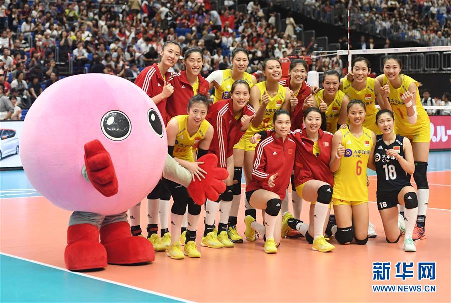 9月19日,中国队球员赛后合影。 当日,在日本横滨举行的2019年女排世界杯赛第一阶段A组循环赛比赛中,中国队以3比0战胜日本队。 新华社记者贺灿铃摄