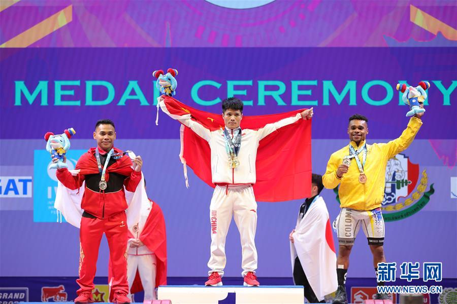 9月19日,冠军中国选手李发彬(中)、亚军印尼选手伊拉万、季军哥伦比亚选手莫·瓦伦西亚在颁奖仪式上。 当日,在泰国芭提雅举行的2019世界举重锦标赛男子61公斤级比赛中,中国选手李发彬以抓举145公斤,挺举173公斤,总成绩318公斤包揽三项冠军,并且打破总成绩和抓举两项世界纪录。 新华社记者张可任摄
