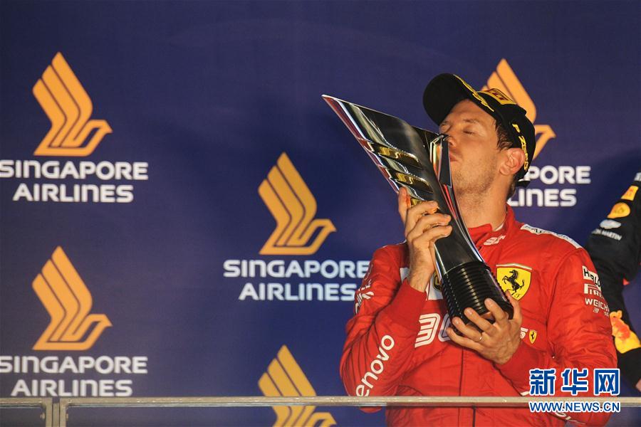 9月22日,维泰尔在颁奖仪式上亲吻奖杯。 当日,在2019年F1新加坡大奖赛正赛中,法拉利车队德国车手维泰尔夺冠。 新华社发 (邓智炜摄)