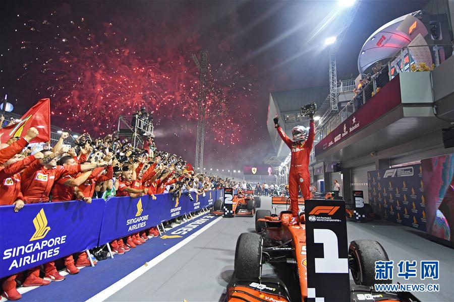 9月22日,维泰尔在比赛后庆祝胜利。 当日,在2019年F1新加坡大奖赛正赛中,法拉利车队德国车手维泰尔夺冠。 新华社发 (邓智炜摄)