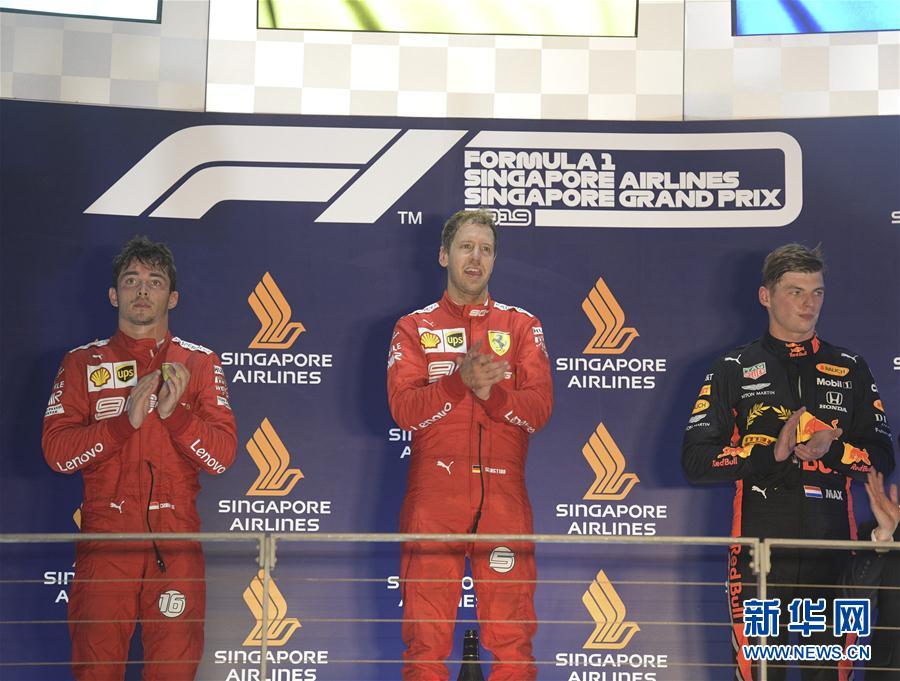 9月22日,维泰尔(中)、勒克莱尔(左)与维斯塔潘在颁奖仪式上。 当日,在2019年F1新加坡大奖赛正赛中,法拉利车队德国车手维泰尔夺冠,法拉利车队摩纳哥车手勒克莱尔与红牛车队荷兰车手维斯塔潘分获亚军和季军。 新华社发 (邓智炜摄)