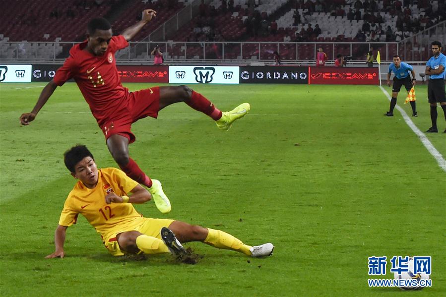 9月22日,中国队球员徐彬(下)与印尼队球员费利克斯在比赛中拼抢。 当日,在雅加达举行的2020年亚足联16岁以下(U16)锦标赛预选赛G组一场小组赛中,中国队以0比0战平印度尼西亚队。 新华社发(阿贡摄)