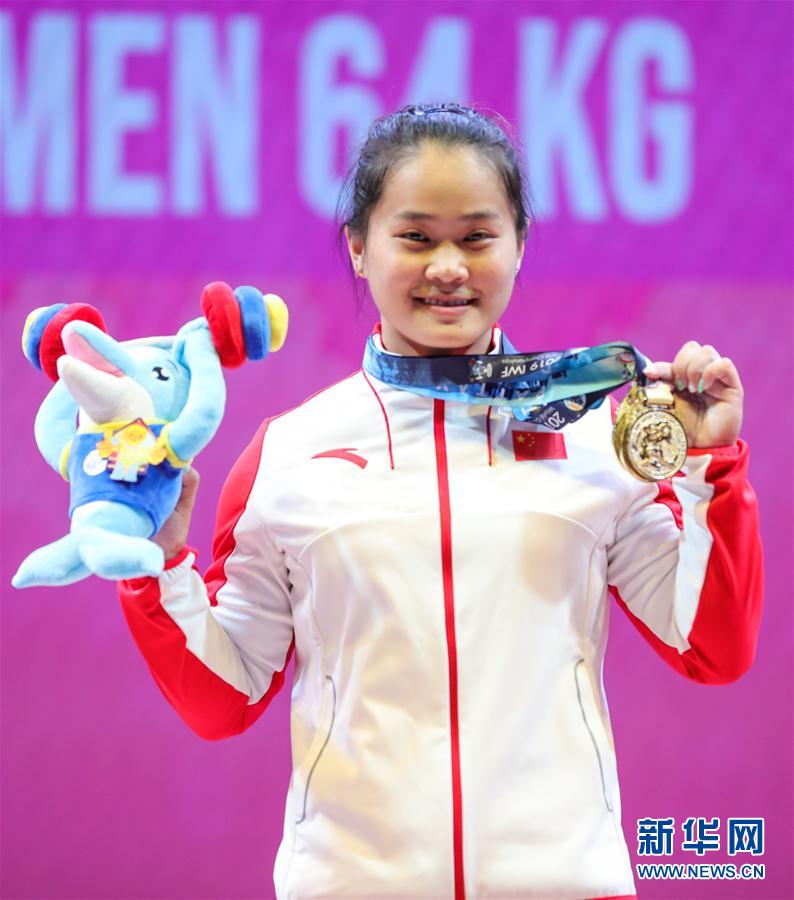 9月22日,中国选手邓薇在比赛后展示获得的三枚金牌。 当日,在泰国芭提雅举行的2019世界举重锦标赛女子64公斤级比赛中,中国选手邓薇以抓举116公斤、挺举145公斤和总成绩261公斤轻松包揽三冠,同时打破了三项世界纪录。 新华社记者张可任摄