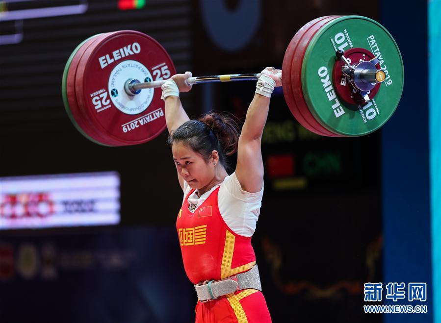 9月22日,中国选手邓薇在挺举比赛中。 当日,在泰国芭提雅举行的2019世界举重锦标赛女子64公斤级比赛中,中国选手邓薇以抓举116公斤、挺举145公斤和总成绩261公斤轻松包揽三冠,同时打破了三项世界纪录。 新华社记者张可任摄