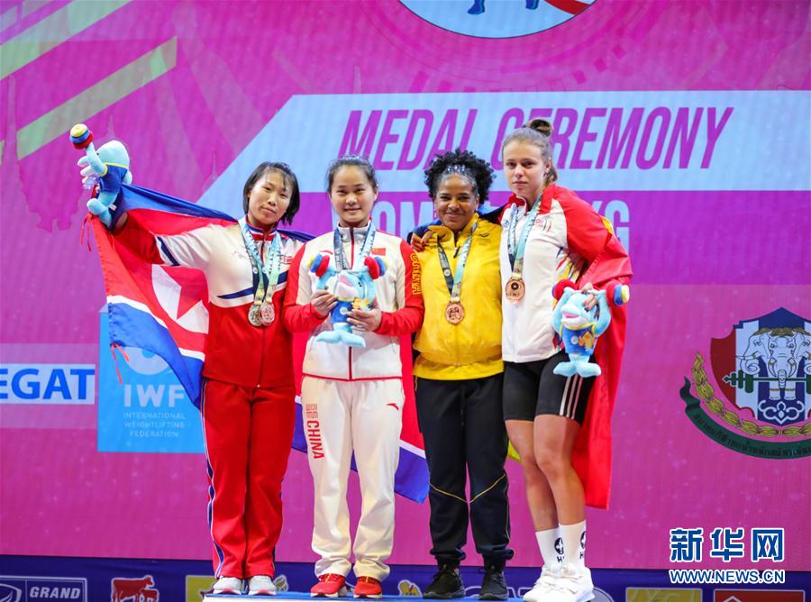 9月22日,中国选手邓薇(左二)与获奖运动员在颁奖仪式上合影。 当日,在泰国芭提雅举行的2019世界举重锦标赛女子64公斤级比赛中,中国选手邓薇以抓举116公斤、挺举145公斤和总成绩261公斤轻松包揽三冠,同时打破了三项世界纪录。 新华社记者张可任摄