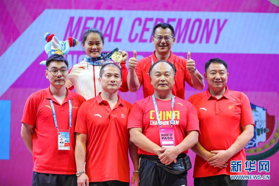 9月22日,中国选手邓薇(左上)与教练组合影。 当日,在泰国芭提雅举行的2019世界举重锦标赛女子64公斤级比赛中,中国选手邓薇以抓举116公斤、挺举145公斤和总成绩261公斤轻松包揽三冠,同时打破了三项世界纪录。 新华社记者张可任摄
