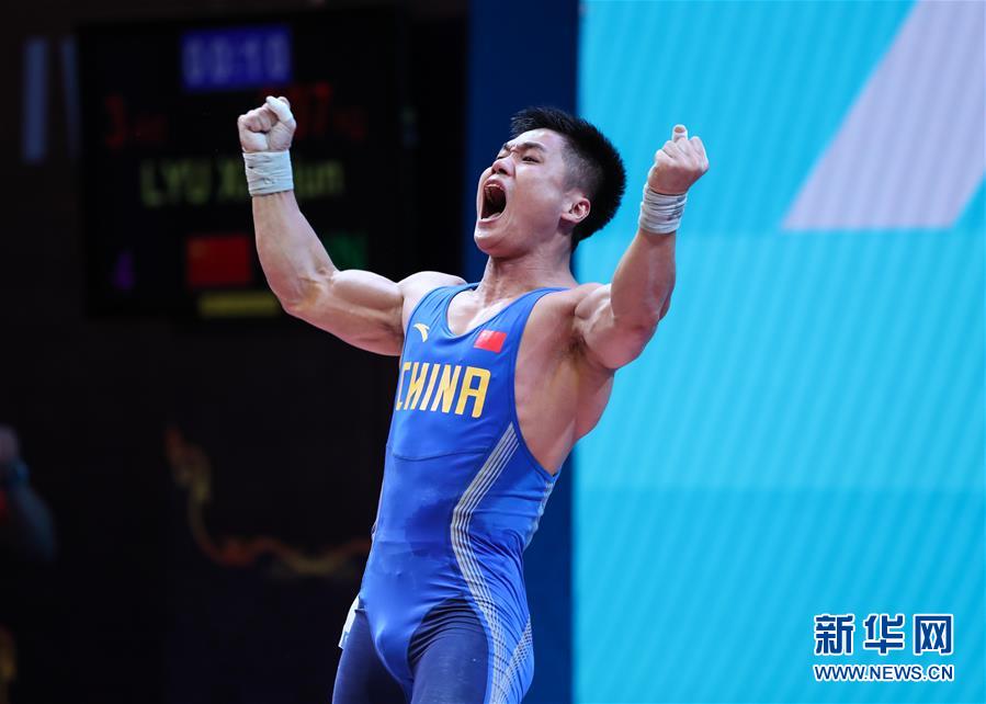 9月22日,中国选手吕小军在比赛中庆祝。 当日,在泰国芭提雅举行的2019世界举重锦标赛男子81公斤级比赛中,中国选手吕小军以抓举171公斤、挺举207公斤和总成绩378公斤包揽三枚金牌,同时创造了该级别挺举和总成绩两项新世界纪录。 新华社记者张可任摄
