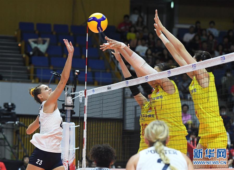 9月23日,美国队球员罗宾逊(左)在比赛中进攻。 当日,在日本札幌举行的2019年女排世界杯赛第二阶段A组循环赛中,中国队以3比0战胜美国队。 新华社记者贺灿铃摄