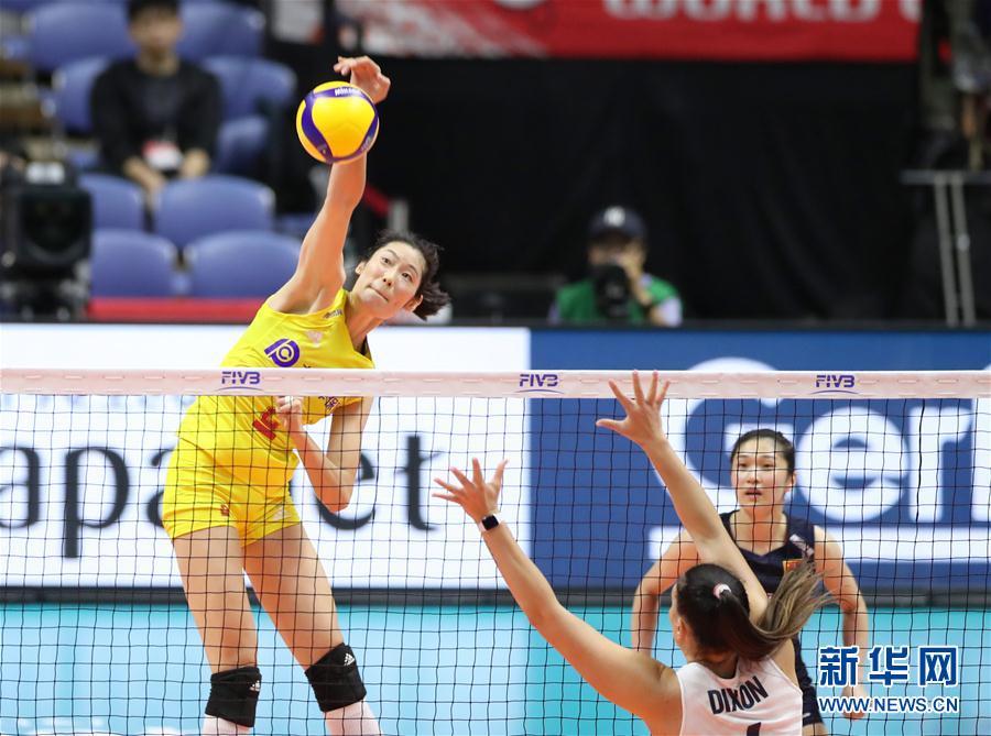 9月23日,中国队球员朱婷(左)在比赛中扣球。 当日,在日本札幌举行的2019年女排世界杯赛第二阶段A组循环赛中,中国队以3比0战胜美国队。 新华社记者杜潇逸摄