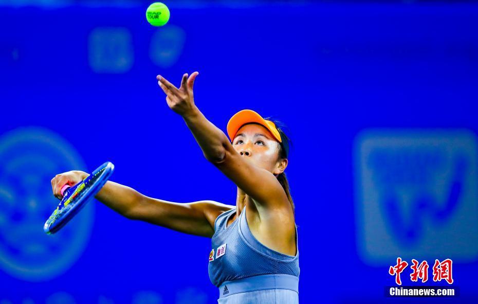 9月23日,中国选手彭帅在比赛中发球。当日,在2019年WTA武汉网球公开赛女子单打首轮比赛中,中国选手彭帅以0比2不敌西班牙选手穆古拉扎。中新社记者 张畅 摄