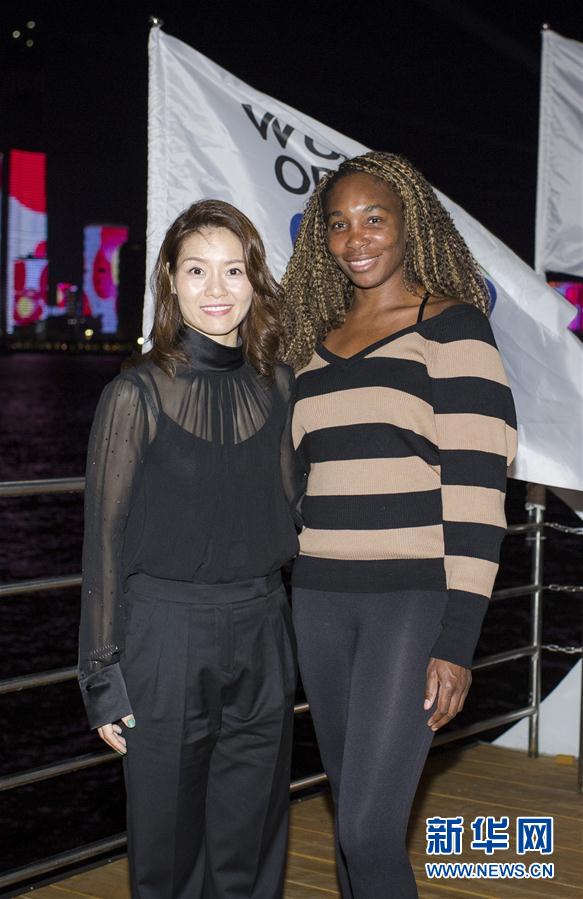 9月23日,李娜(左)与维纳斯·威廉姆斯在活动中合影。 当日,中国网球名人李娜携手武汉网球公开赛美国参赛选手维纳斯·威廉姆斯在武汉江汉关码头乘船夜游长江。 新华社记者肖艺九摄