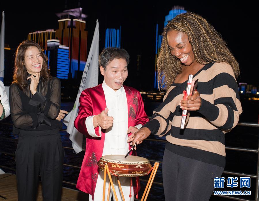 9月23日,维纳斯·威廉姆斯(右)与李娜(左)在活动中体验湖北大鼓。 当日,中国网球名人李娜携手武汉网球公开赛美国参赛选手维纳斯·威廉姆斯在武汉江汉关码头乘船夜游长江。 新华社记者肖艺九摄