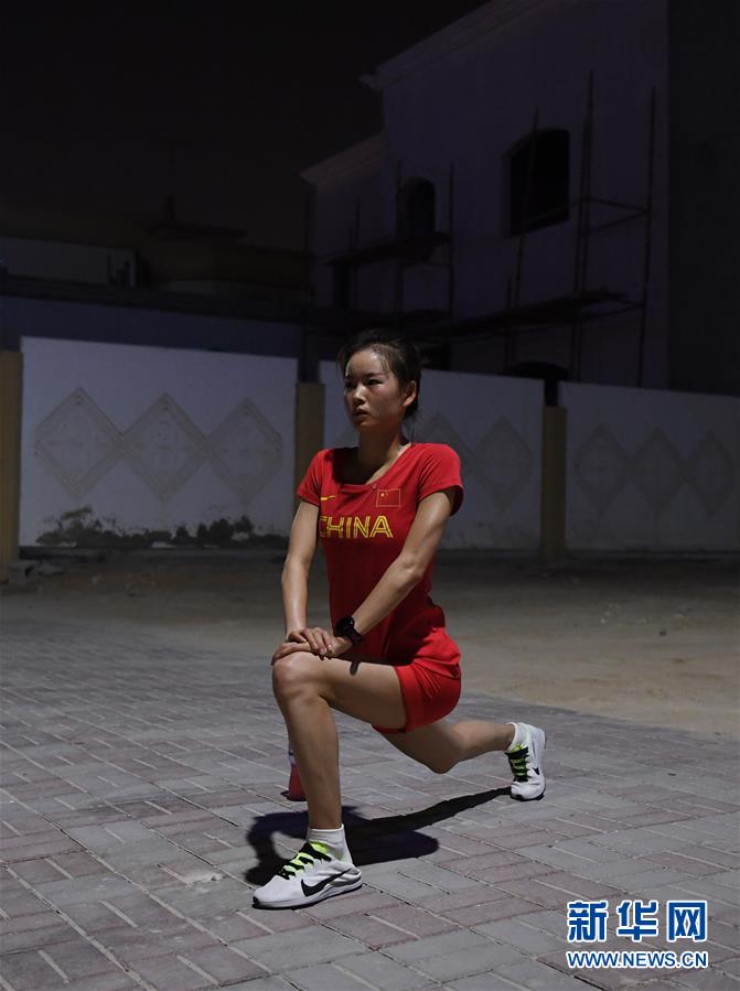 9月23日,杨家玉在训练后拉伸。 当日,中国竞走运动员杨家玉与梁瑞在卡塔尔多哈进行训练。杨家玉、梁瑞将分别参加2019国际田联世界田径锦标赛女子20公里竞走、女子50公里竞走的比赛。 新华社记者贾宇辰摄